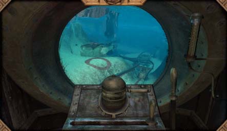 Okay, now look up, open the hatch and climb up the metal rungs in the cliff. Flip all the levers to the up posistion- this reposistions all of the village ladders so they may be reached to from the air pockets where the sub stops. Go back to the sub, swivel it around and head back. Turn left at the next junction you encounter to reach.....